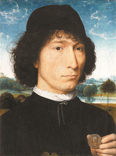 要说与《手持圆形圣像的年轻男子》相比最具参照价值的画作,当属汉斯·梅姆林于几乎同年完成的《手持罗马钱币的男子肖像》。这幅具有典型佛兰德斯肖像特征的作品描绘了以唯美自然风光为背景的一位四分之三侧脸绅士胸像,从构图而言可以说是波提切利《手持圆形圣像的年轻男子》的“镜像版”。值得一提的是,这位身份未知的男子手持一枚雕有罗马皇帝尼禄头像的古币,意指其对人文主义的关注,这一细节也与波提切利手持圣像的帅哥异曲同工。