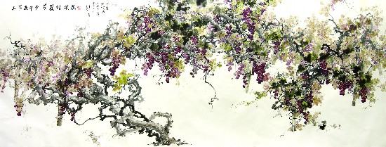 “连枝盈紫气,满架发清香。疑自瑶池下,人间献瑞祥。”这是我在欣赏卢一心先生以葡萄为题材创作的诸多作品时乘兴所撰的一首短诗。