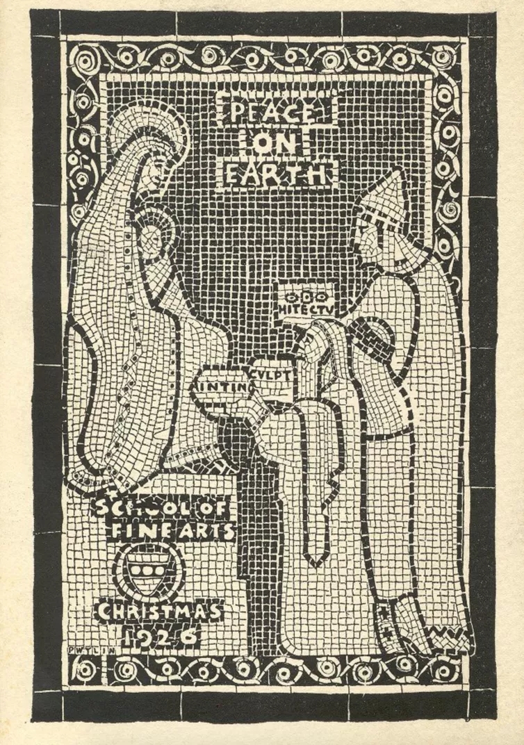 林徽因在宾大时就展露出设计方面的才华。1926年,她为美术学院设计了一张圣诞卡,采用马赛克镶嵌画的风格,有点罗马或者拜占庭的味道。画中东方三博士手持礼盒上的字是painting(绘画) sculpture(雕塑)和architecture(建筑),寓意造型艺术三姐妹。据梁再冰回忆,林徽因和梁思成还为此吵了一架。林徽因说这是她的创意,希望自己画出来;但梁思成觉得自己画得更好,应该由他来画。林徽因说不行,大家都能看出这是你画的,到时候我就穿帮了。