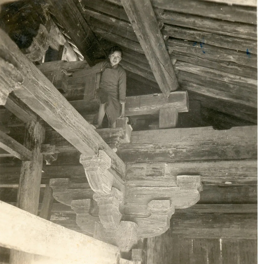 她还穿着旗袍爬上过河北正定开元寺钟楼的梁架。照片中可见硕大的斗栱,基本上有林徽因那么高。梁思成断代这个梁架的一部分有可能是唐代的,虽然留存至今完整的唐代木构建筑只剩三个,开元寺钟楼可能可以算半个,很珍贵。