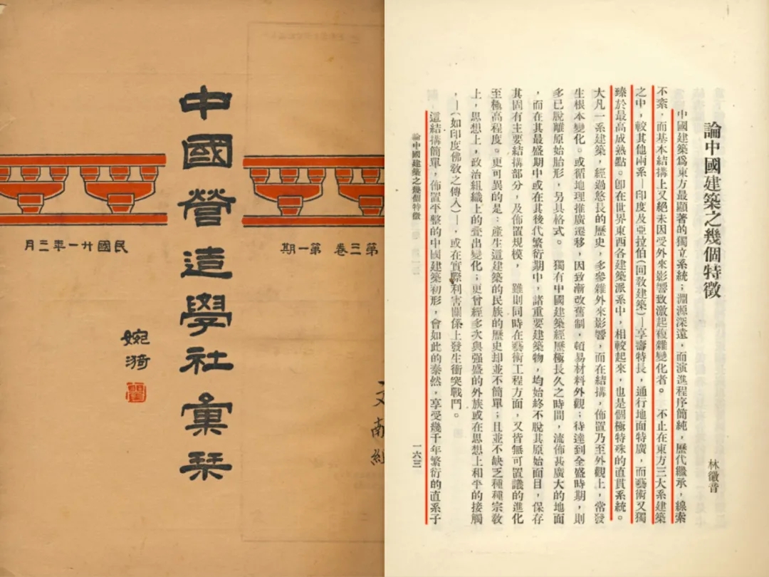 1932年林徽因在《中国营造学社汇刊》第三卷第一期发表《论中国建筑之几个特征》