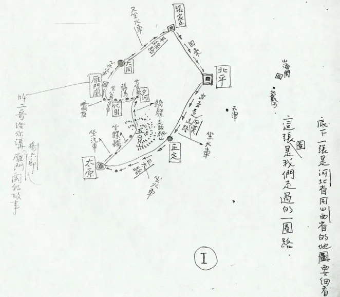 林徽因的文体又变了,和写诗、写建筑学论文不同,跟小孩子写的文字是这样的。她还详细画了一张图叫“我们走过的一圈路”,让孩子在这么危急的关头还顺便学一学地理知识。