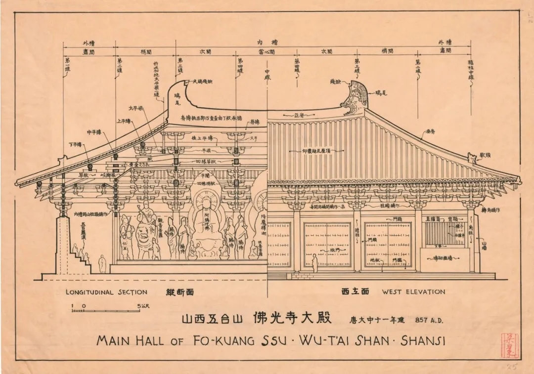 梁思成之所以开宗明义就写下上面这段文字,其实是被日本人逼的。因为日本学者伊东忠太研究中国古建筑比他们早多了:他从1901年开始研究北京古建筑,这一年梁思成刚刚出生,等到梁、林加入中国营造学社,伊东忠太已经成为一代宗师。受邀到营造学社做演讲时,伊东忠太建议将来中日合作共同研究古建筑时,中国学者负责在书斋里查阅文献,日本学者负责进行田野考察。所以梁思成针锋相对,开篇就指出研究古建筑一定得做实地调查测绘。