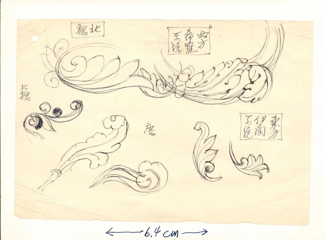 此时期林徽因还在做一些建筑史的研究,可惜只有残缺的稿子,没有最终完成,是继云冈石窟以后对敦煌石窟纹饰的研究——《敦煌边饰初步研究稿》。此时她已经能轻松地画出北魏、唐代纹饰什么味道,波斯以及希腊纹饰又是什么味道。