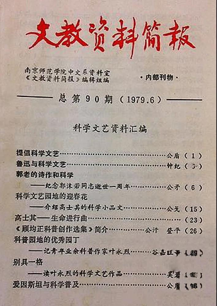 郑公盾人特别胖。我一定是在哈尔滨会议上跟他开始的交往,我只记得他当时就说,我们住得很近,“你找一天到我家,我那里有一本书里面收录了我的文章,也收录了你的文章,我正好有两本”。我那个时候家住在北京市东城区灯市口同福夹道四号空政文工团的院子里,而他住在史家胡同,跟我只有一个丁字路口的距离。我如期赴约到他家,他从书架上取到一本由南京师范学院中文系资料室编辑的《科学文艺资料汇编》。这其中,他的文章《提倡科学文艺》是全集的首篇。此外还有《爱因斯坦与科学普及》《为凡尔纳的科学幻想小说恢复名誉》《法拉第和他的科普名作〈蜡烛的故事〉》,署名公盾。更有署名公矛的《郭老的诗作和科学——纪念郭沫若同志逝世一周年》、公戈的《科学文艺园地的迎春花——介绍高士其的科学小品文》,以及署名公汗的两篇作品。我觉得所有这些其实都是他写的。在那个年代里,由于作者极端短缺,许多报刊就会集中瞄准一个作者写许多文章。但在发表的时候,由于处于同一个版面或一期杂志,一个人的名字不能出现多次,因此换名字是常事。叶永烈老师常常就在《文汇报》科技版上占据整个版面,但除了一个文章署名叶永烈之外,其他的文章都会用阿烈、阿艇、叶舟、叶丹作为作者名。后面两个名字其实是他儿子的名字。当然,他儿子上中学后,也开始了科普创作,还出版过专门的书。这些都是后话。郑公盾给我的选集中,有我《别具一格——读叶永烈的科学文艺作品》一文。