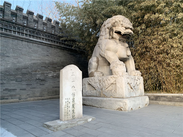 此地建筑由留英建筑师沈琪设计,称得上美轮美奂。一百多年过去,桁梁依旧坚实,雕花依旧精美,冬日阳光照耀其上,兀然有穿越之感。它们和门前的石狮一起,见证了一段“城头变幻大王旗”的历史:1911年清帝逊位,帝制完结;1912年这里变成了袁世凯的总统府;1924年又变成了段祺瑞执政府所在地,1926年段祺瑞当政期间制造的“三·一八”血腥惨案,就发生在这对石狮子的前方。如今大门东侧石狮旁边,立着一尊朴素的汉白玉石碑,上书“‘三·一八’惨案发生地”八个大字。