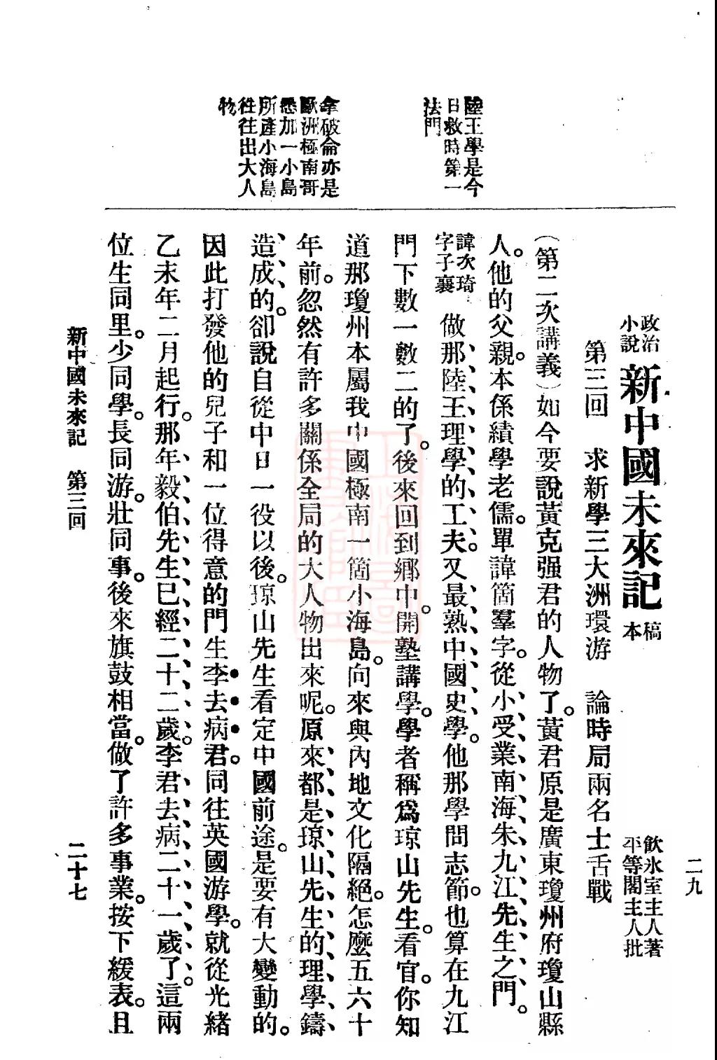 梁启超的科幻文学活动“暴露”于1902年。是年,他不但在自己主编的《新小说》杂志连载《新中国未来记》,发表翻译小说《世界末日记》及译后记,还在《论小说与群治之关系》的论文中,为中国小说界革命进行布局论证。次年,他发表了翻译小说《十五小豪杰》。