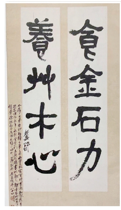 吴昌硕赠予王个簃的隶书四言联“食金石力,养草木心”