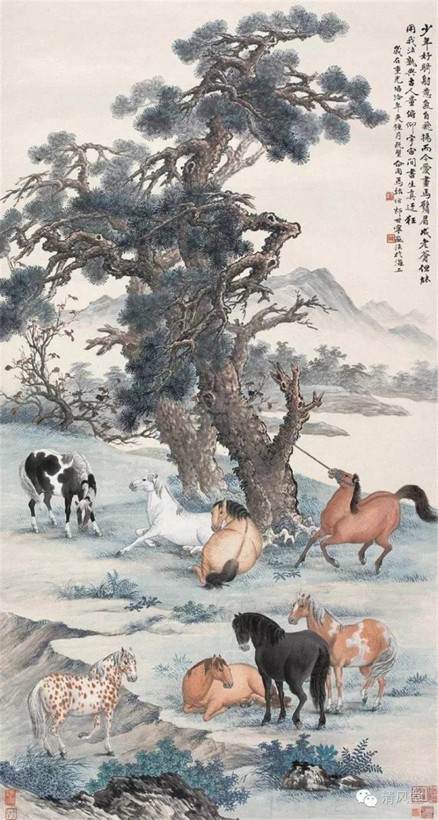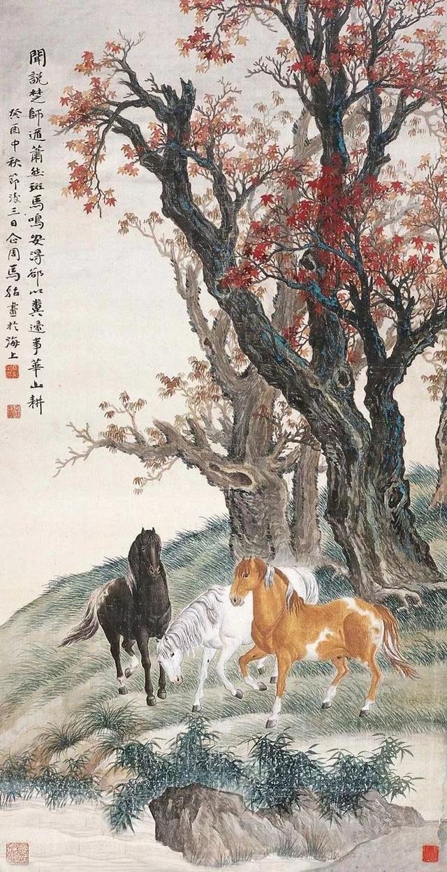 但如果讨论马骀与张大千的绘画成绩,客观地说,抛开张大千的大量临摹或模仿之作,只谈其泼墨泼彩的画法,其对中国山水画的创新,还是必须肯定的,甚至开创了一代风气,影响深远。这种创新和独特的泼墨手法,或许与他早年在日本学习染织有关,或许也与他张扬无忌的性格和行为有关,总之,他在艺术创作这个层面上确实是成功的。而马骀的画一般人见到的不多,我也是最近才在网上看到一些,没想到他对画马的研究也颇有匠心,他的《散牧图》中的卧马尤其让人亮眼,没有沿袭前人,姿态与神情颇为独到。还有《赤马瘦黑马肥》以写意的方法,描写了一瘦一肥两匹马的状态,线条精准,省略处又极富表现力。他的《霜雁一声语》我也很喜欢,姿态生动的大雁,近景的雪芦花和远处的雪山,前后呼应,笔触练达而意境全出。当然,总体看,他的山水画相比张大千的泼墨山水确实创新不足,有些模式化,也相对保守拘谨,缺少感染力和冲击力。但是另一方面说,我对马骀先生的过早离世有些遗憾,52岁,正是一个艺术家创作的黄金时期,英年早逝,这是否也影响了他在画坛的地位和关注度呢?