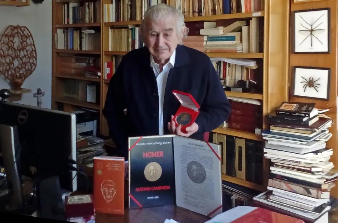 加莫内达在位于西班牙莱昂市达玛索·麦力诺路的家中收到荷马奖章及《加莫内达诗选》