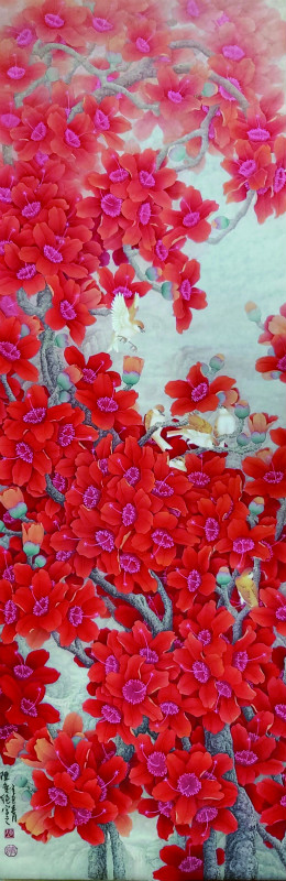这幅《花开有声》的独特之处还在于画家表现的角度,不是惯常的仰视或平视的角度,而是采取一种聚焦,以及层层推进的手法,删去无关紧要者,集中地聚焦于对花的描写,如此集中而强烈铺排的艺术手法,却是过去画木棉者所少见的,这也体现了陈奕纯勇于突破传统的胆量。从人们所意想不到之处落笔,便成就了一种新鲜的艺术的感动。
