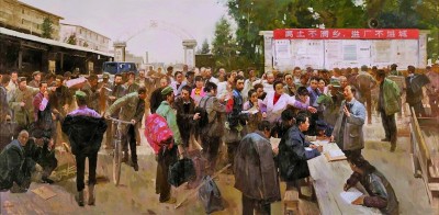 如封治国创作的《春雷》,表现了改革开放之初,苏南地区乡镇企业蓬勃发展,热闹非凡的招工场面。工厂门外,应招的农民从四面八方赶来,有人正在积极询问招工细节,有人正蹲在地上交头接耳、左顾右盼,还有的人将纸张垫在旁人背上奋笔疾书……看似杂乱无章的拥挤画面里,每个人物都定格在极富信息量和极具美感的肢体状态中,加之画面从左到右的人群和建筑共同构成的疏密相间的空间结构,一个极富电影感的“剧场”便形成了。这种剧场感的营造有助于画家表现人物众多的场面,能够调动作品中各种角色的姿态和个性来展开故事情节,使得创作构思的意味得以彰显。