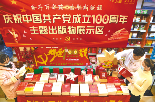安徽省阜阳市新华书店“奋斗百年路 启航新征程”庆祝中国共产党成立100周年主题出版物展示区,读者在选购党史党建书籍。王彪 摄