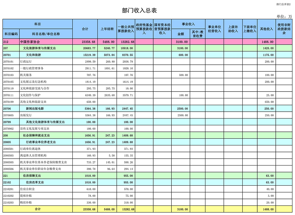 按照综合预算的原则,中国作家协会所有收入和支出均纳入部门预算管理。收入包括:一般公共预算拨款收入、事业收入、事业单位经营收入、其他收入、使用非财政拨款结余、上年结转;支出包括:文化旅游体育与传媒支出、社会保障和就业支出、住房保障支出。