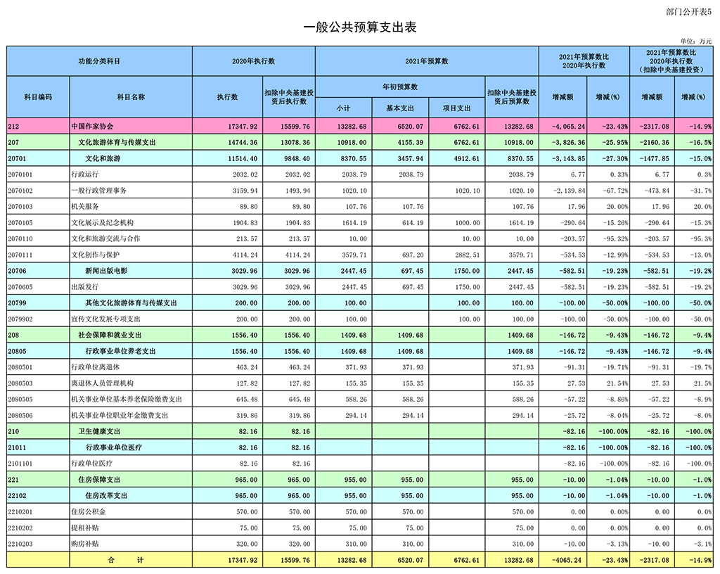 五、关于中国作家协会2021年一般公共预算支出表的说明