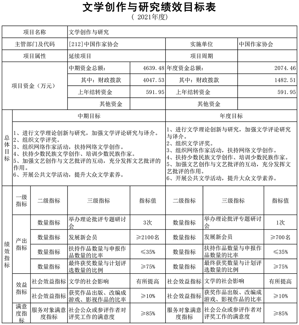 2021年对我会项目支出全面实施绩效目标管理,涉及预算拨款6762.61万元,一级项目8个,二级项目21个。同时,拟对“文学出版与传播”和“组织文学评奖活动经费”2个项目开展部门评价,涉及财政拨款2250万元。根据以前年度绩效评价结果,优化文学创作研究译介经费、作家创作与联络经费等项目支出2021年预算安排,并进一步改进管理、完善政策。