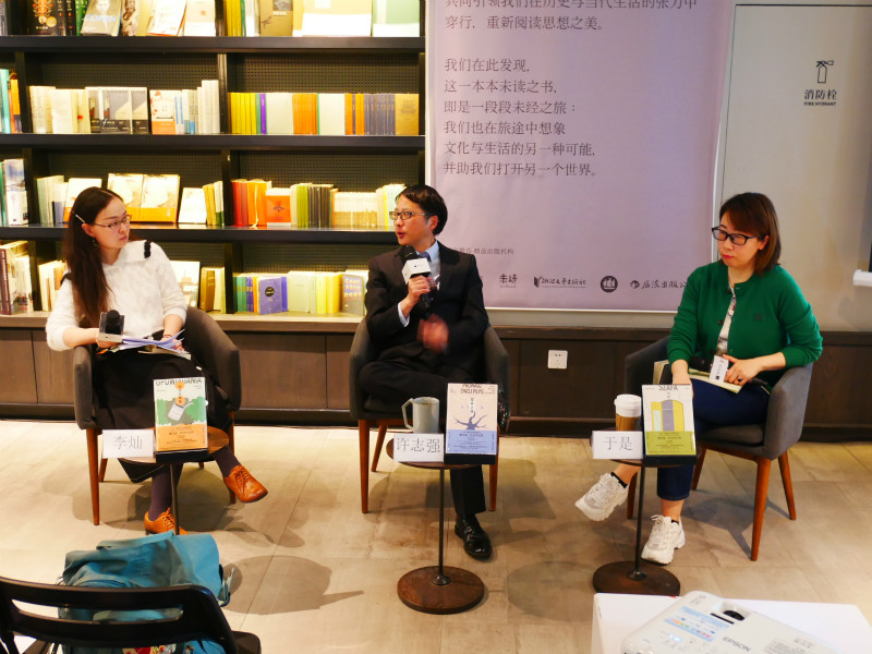3月28日,浙江大学比较文学与世界文学研究所教授许志强(中),文学翻译家、作家于是(右)与文学编辑李灿(左)做客单向空间杭州乐堤港店,就诺贝尔文学奖得主托卡尔丘克新书《糜骨之壤》展开对谈。