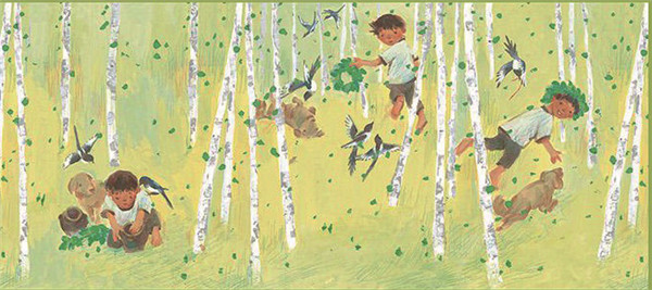 给年幼儿童的绘本,也应该适度地进行挫折教育、苦难教育。令我钦佩的是,《喜鹊窝》所反映的严酷的沙漠生活里的艰辛、磨难,并不是被大呼小叫地喊出来的,而是不动声色地表现出来的。之所以能不动声色,是因为作品背后有强大的信念在支撑。沙娃一家的家园被毁后,文字故事以走向沙漠深处结束,但是,后环衬依然在叙述故事。在后环衬上,近处有繁茂的白杨树和“海子”,远处浮现出了绿洲。绿色,是希望的颜色。这显然昭示了灾难后的希望,表现了乐观主义的人生观。对于写给年幼儿童的绘本,表现虚无和悲观,是死亡的暗示,表现达观和乐观,则是对生命的鼓舞。