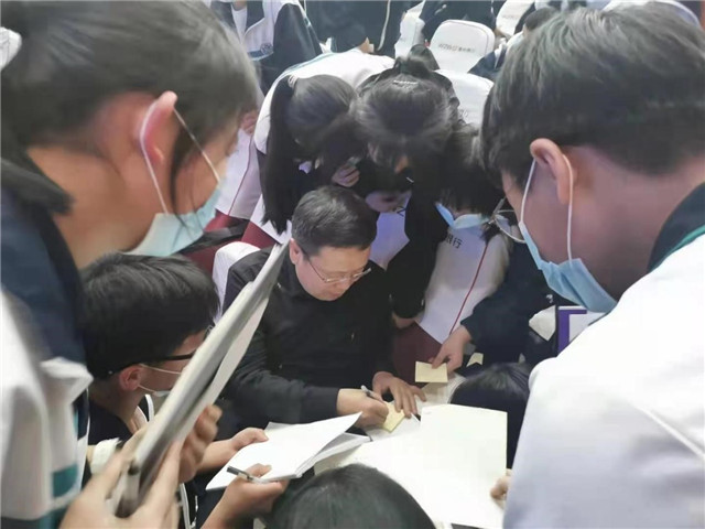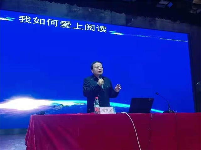 在龙湾中学,管平潮做了题为“阅读让心灵群星闪耀”的分享,用轻松幽默的方式向师生们介绍了他多年的阅读和创作体验。管平潮认为,兴趣是最好的老师,好的阅读习惯使人受益良多:不仅能提升学习工作效率和综合素质,更能开阔视野、滋养心灵。他劝告青年学生,阅读不是为了炫耀,而是为了让读过的书化为生命的养料,让自己成为比昨天更好的人。
