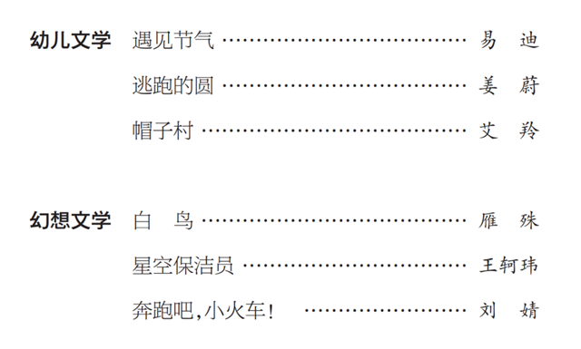 为发现和培养更多的新作者,支持鼓励优秀少儿文学的创作和出版,“冰心奖”特设“冰心儿童文学新作奖”。