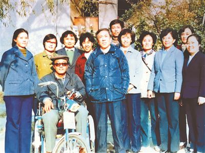 上世纪八十年代初,史铁生(前坐者) 与同学看望王玉田(前排右五)、 董玉英(前排右四)老师