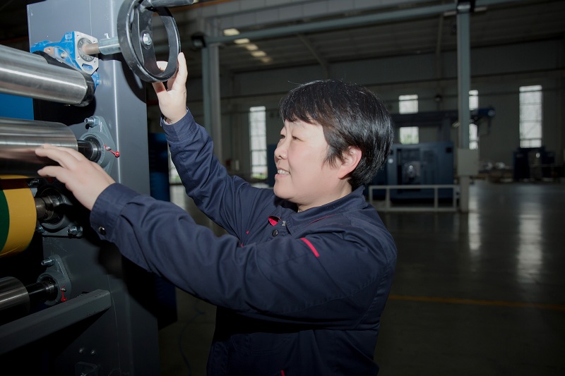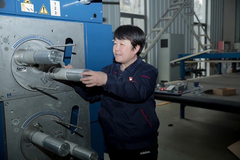 4月29日,这天上午,于素梅早早就来到了厂里,整理和打印为中复神鹰碳纤维公司高端碳纤维生产线设计的部分纺丝设备图纸。她跟我说过:她对图纸有感情。这我理解——1987年,大学刚毕业的于素梅被分配到连云港纺织机械厂(连云港鹰游纺机集团有限公司前身)技术科工作,从此她就立足技术岗位,扎根生产一线。在具体工作中,她以一个年轻技术员的身份,完成了烫剪联合机、水洗机、磁棒印花机等10余种新产品的设计的主创研发。那时候,她干得最多的工作,就是画图。2005年公司重组后,于素梅从纺织设备的开发投身于碳纤维装备与技术研发工作。当时,碳纤维属于高性能纤维,在国外都属于技术保密项目,而外国公司为了获取更大的利益,只愿意高价出售产品,而不出售设备与技术。为打破国外碳纤维技术封锁,董事长张国良禀持“为祖国争光、为民族争气”的坚强信念,抽调于素梅等技术骨干专门攻克高性能碳纤维产业化难题。接下来,在两个多月时间里,于素梅所在团队画了近万张设计图纸,不断解决遇到的各种难题,终于打通了聚合、纺丝、碳化全部工艺流程,完成了年产500吨原丝生产线和年产100吨碳化生产线全部装备的研制工作,形成了百吨级碳纤维的成套生产线,并于2007年5月首次连续生产出合格的碳纤维。正是在此基础上,于素梅与同事们相继完成多条碳纤维生产线,以及碳纤维预浸布的复合材料预浸设备生产线的设备的设计开发工作,实现了T300/ T700/T800级碳纤维及原丝设备的全部国产化、规模化生产。她和同事们研发的“干喷湿纺千吨级高强/百吨级中模碳纤维产业化关键技术及应用”项目获得2017年度国家科技进步一等奖。今天,她要根据图纸指导工艺人员明确其中的关键零部件,以提醒其在编写加工工艺时的注意事项。考虑到进口轴承供货周期长,她又安排提前为采购人员提供设备中选用的进口轴承型号及数量明细表,方便其与供应商交流,避免因轴承交货不及时影响设备装配从而影响整个生产线的交付时间。就这样说说做做,一个上午过去了。到了下午,她又开始了编写中复神鹰公司购置的4米碳化线部分设备使用说明书工作。