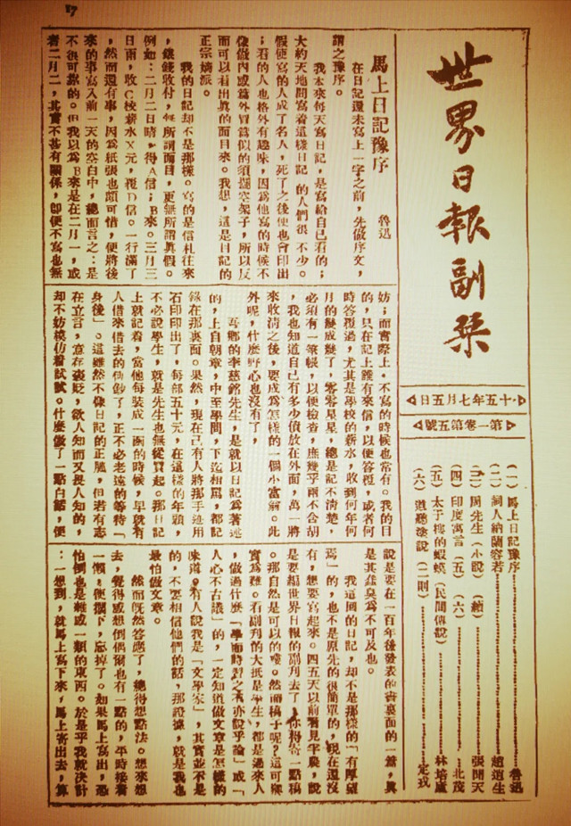 “马上日记”名曰“日记”实为杂文,因此上文给“日记”二字加了引号。相应地,为了便于论述,下文把每篇日记的日期作为篇名使用。发表《马上日记》前,鲁迅在7月5日《世界日报副刊》上发表了《马上日记豫序》(收入《华盖集续编》时改题为“豫序”)。在该序中,鲁迅表示答应了刘半农的约稿后,“想来想去,觉得感想倒偶尔也有一点的,平时接着一懒,便搁下,忘掉了。如果马上写出,恐怕倒也是杂感一类的东西。于是乎我就决计:一想到,就马上写下来,马上寄出去,算作我的画到簿”[2]。可见,所谓“马上日记”就是对自己感想的即时记录。在鲁迅的“文体探索史”上,“马上日记”的写作具有多重意义。结合八年前创作的《狂人日记》来看,写“马上日记”是在继续探索日记文体的可能性。小说可以写成日记体,杂文同样可以。在此意义上,《豫序》与12篇“日记”,《狂人日记》小序与正文,具有相同的结构关系。鲁迅通过二者之间的张力,强化、丰富作品的主题。《豫序》也是鲁迅的“日记论”。他在其中介绍了“日记的正宗嫡派”、自己日记的流水账写法、同乡李慈铭的“以日记为著述”,然后说明“马上日记”的构想。结合鲁迅从前的《随感录》《忽然想到》等杂文系列来看,“马上日记”这个题目本身再次确认了杂文这种新兴文体的本质——即时性、现实性、针对性、个人性。“随感”“忽然想到”“马上”等词语表达的是短暂的时间状态,“感”与“想”都有特定的主体,相应地,“录”或“记”这种书写行为受到时间与主体的制约,会对文体形式提出要求。