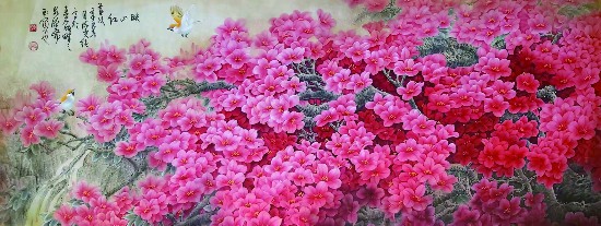 这种高雅与风华,在画面上表现突出得当,整幅画是令人愉悦的,花瓣分明的刻画,红而不妖,红而不艳,红而不俗。画面疏密、浓淡、主次,妥帖到位,充满动感,映山红争相竞放,那份生动蓬勃、盎然生气,十分感人。而画中鸟的穿插,亦不是可有可无的,进一步增加动感。山水的偶然峥嵘,也使画面更为丰富,深化了作品的意境。透过画面,我们能够深切地感受到陈奕纯内心对中国共产党无限的敬仰之情。