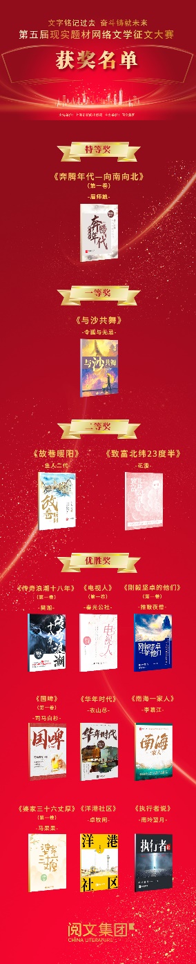 5月25日,由上海市新闻出版局支持,阅文集团主办的第五届现实题材网络文学征文大赛颁奖仪式在沪举办。大赛共评选出十三部获奖作品,聚焦改革开放后青年群体成长奋斗的《奔腾年代——向南向北》获特等奖,讲述中国科技出海故事的《与沙共舞》获一等奖。