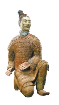 展厅内,来自陕西西安秦始皇帝陵博物院的两尊兵马俑格外引人注目。一尊彩绘绿面跪射俑单膝跪地,它是秦陵兵马俑中发现的唯一绿面俑,极少出馆展陈;另一尊紫衣御手俑头部缺失,双手前伸,似在持缰御马。