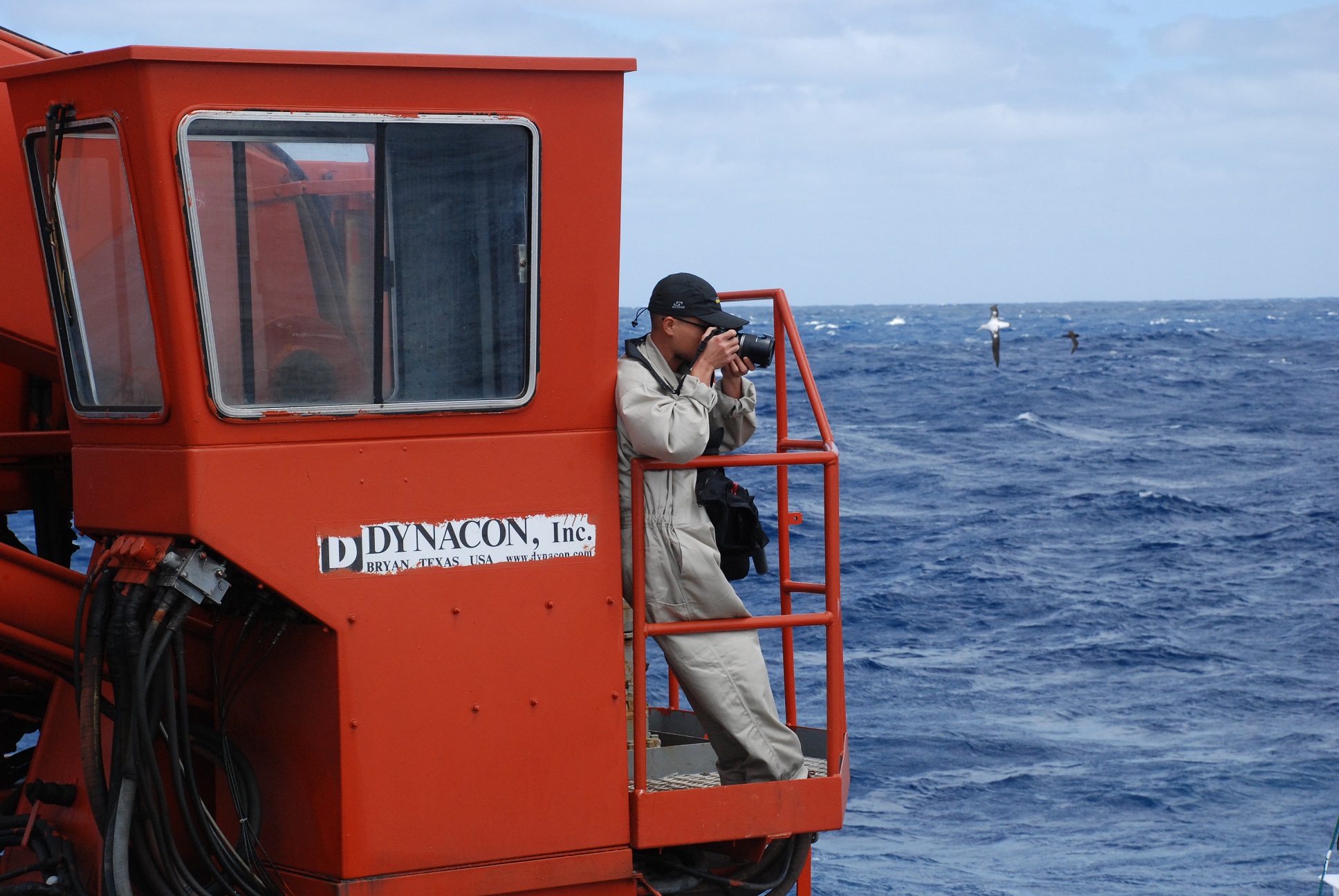 大洋一号船搭载着科考队员在西南印度洋开展科考,作者登上船尾吊车记录科考过程,远处的海鸟时刻注视着船边泛起的浪花,那里时常有它们爱吃的飞鱼一跃而出。