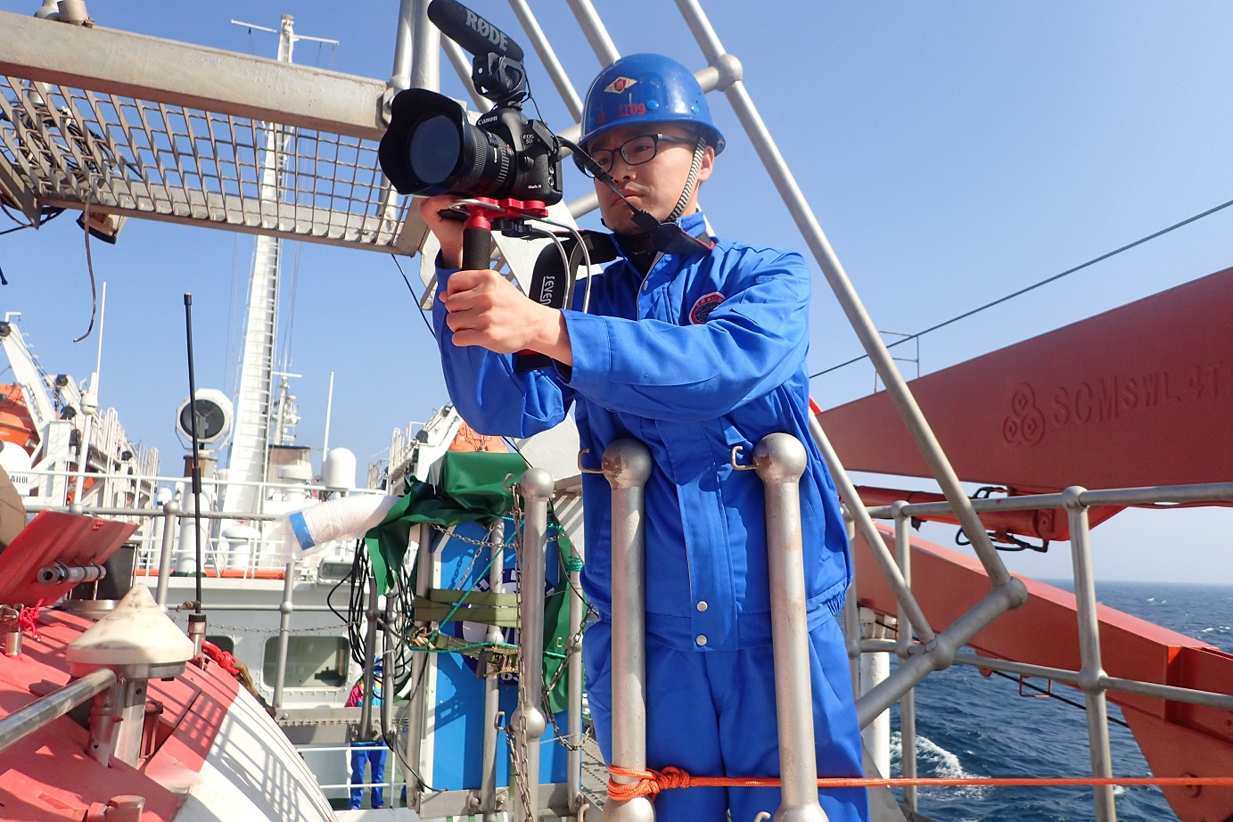 作者跟踪拍摄蛟龙号在太平洋开展科学考察,此时科考队员正在为蛟龙做保养,作者举起摄像机记录每一个工作瞬间