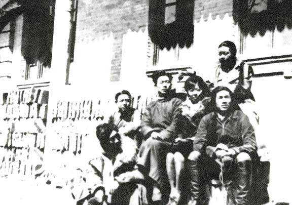 左起塞克、田间、聂绀弩、萧红、端木蕻良,后排为丁玲。1938年摄于西安八路军办事处