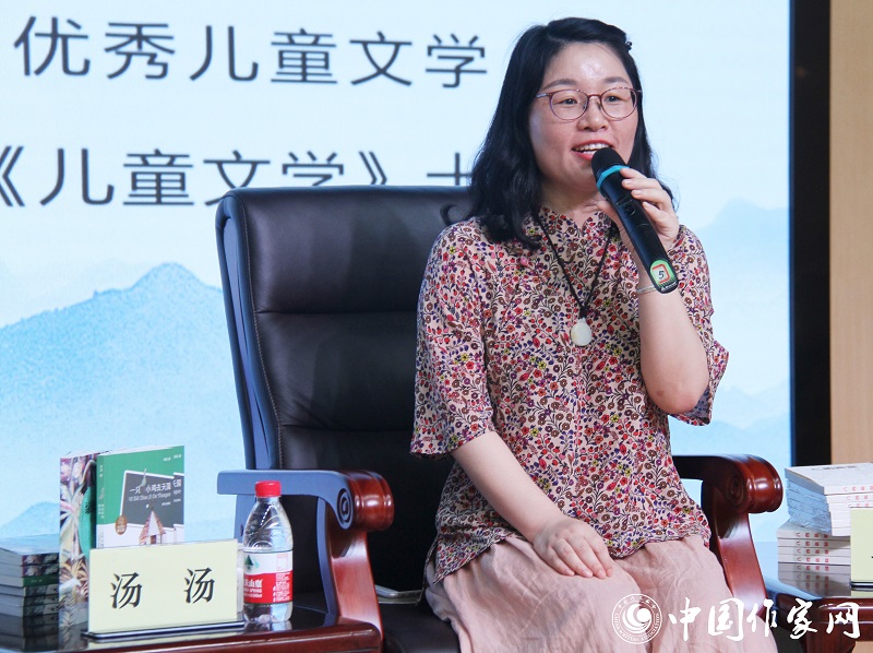 儿童文学作家汤汤也是一名小学语文教师,她坦言,还未开始写作前曾对儿童文学存有某种偏见,认为儿童文学讲述的就是“王子与公主从此过上了幸福的生活”“大灰狼与小白兔”之类的简单故事,没有深刻内容,只供儿童阅读,与成人无关。通过现场讲述童话作品《大海的尽头在哪里》,她向读者介绍了自己转变偏见的过程,认为儿童文学其实并不简单,它的内涵极其丰富;儿童文学也能反映现实生活,揭露社会现状;优秀的儿童文学作品可以激发孩子们的创造力与想象力。她希望自己能继续保持文学初心,用爱与智慧,为孩子们写出更多更好的儿童文学作品。