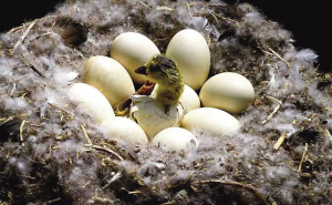 2001年5月,在青海湖鸟岛潜伏的葛玉修,发现一个鸟巢的9个蛋中,有个蛋裂开了一个小洞,里边还传出“叽叽”声。“雏雁即将出壳”,想到这里,葛玉修悄然隐蔽地趴在雁巢附近,忍着烈日的蒸烤和扑鼻的鸟粪臭,耐心等待4个多小时,终于拍到雏雁出壳的全过程。而后,他又陆续拍到雏雁学步、涉水的镜头,最终形成组照《生命礼赞》,作品在黄河流域九省(区)艺术摄影展中获得金奖。