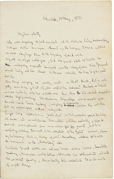 1870年5月31日写于英国曼彻斯特。该信是马克思与小女儿艾琳娜在曼彻斯特恩格斯家中做客时写给女儿燕妮的信。信中,马克思谈到了恩格斯当时正在撰写的著作《爱尔兰史》和弗·阿·朗格的《工人问题》,落款老尼克(Old Nick)。此信收入《马克思恩格斯全集》第32卷。