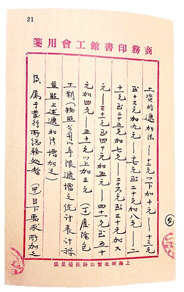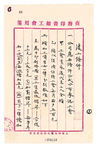 1925年8月,商务印书馆爆发了“要求加薪及平等待遇大同盟罢工”。8月24日,13位职工代表举行联席会议,商订复工条件,沈雁冰负责执笔起草谈判文件,在会议当场写成了这份《复工条件》。《复工条件》包括“公司应无条件正式公布承认工会”“增加工资”“减短每日工作时间”等九项内容。