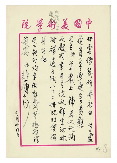 袁同礼(1895—1965),字守和,主持北平图书馆(今中国国家图书馆)工作22年,奠定了中国现代图书馆的基础,推动了我国图书馆事业的发展,特别是抗战时期,他广泛寻求文化合作互助,为中国学术文化事业、文化抗战及与世界的文化交流作出了积极贡献。该信展示了徐悲鸿与袁同礼之间关于购书等事的交往。