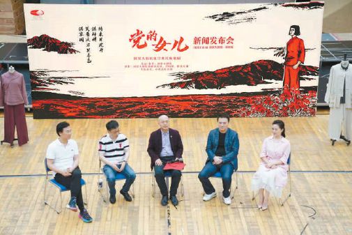 主创团队介绍《党的女儿》排练进度。 本报记者 方非摄