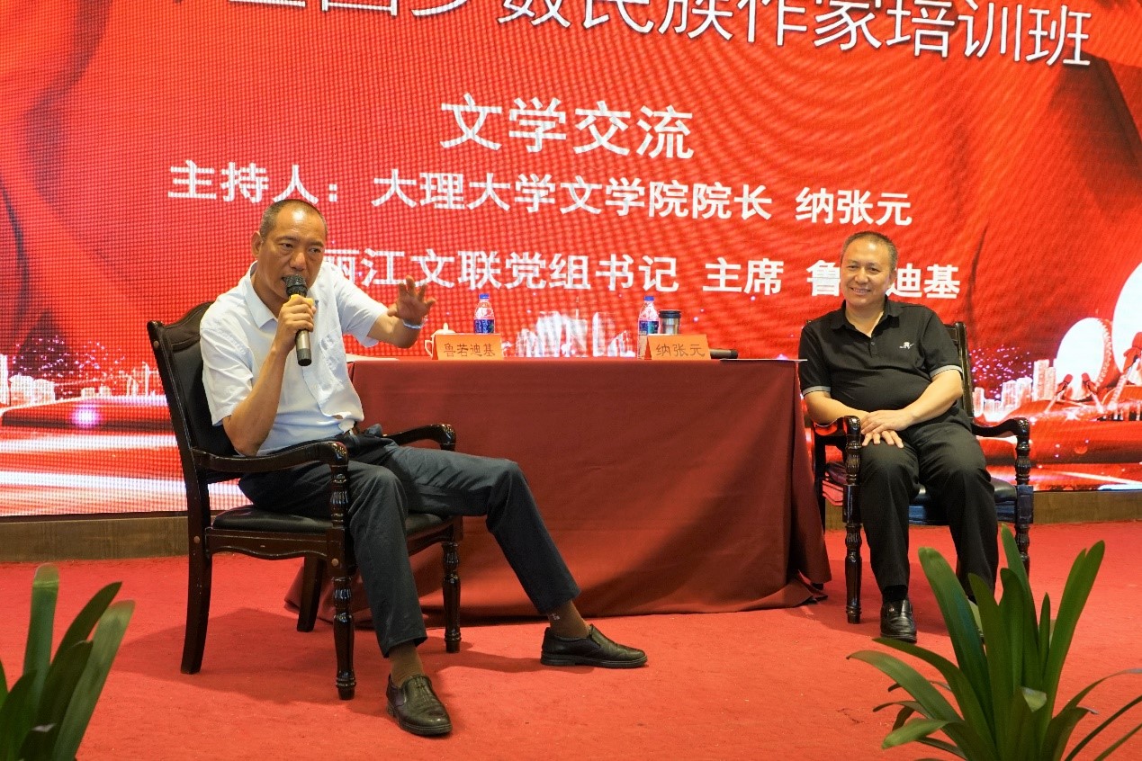 培训班期间,还举办了一场名家对谈,丽江市文联党组书记、主席鲁若迪基与大理大学文学院院长纳张元两位少数民族作家基于自身创作,对少数民族文学的创作空间展开了探讨。鲁若迪基以自己的诗《1958年》开篇,讲述了对少数民族文学的整体看法。他认为,新中国成立后,在党的领导下,濒临灭绝的少数民族口传文学得到了抢救和保护,少数民族作家也开始拿起笔来撰写自己民族的故事。他很关注近些年的脱贫攻坚文学创作,认为少数民族文学创作要深入生活,挖掘和书写本民族灵魂深处的东西;同时也要向外探测,开拓新的创作领域。纳张元则认为,为民族代言,为民族立传,几乎是每一个少数民族作家与生俱来的创作理想和创作使命。我们敬重这种责任意识和担当精神,同时文学创作具有特殊性,好作品也需要充分彰显作家的个性,作家的独特个性是作品腾飞的翅膀。
