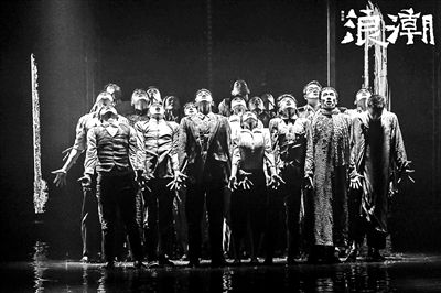 现代舞语汇也是烘托这个意象空间的重要元素。不同于当下戏剧中常看到的歌(舞)队形式,《浪潮》的群舞演员并不直接参与情节、点评情节,他们仅仅通过肢体来凸显浪潮这一意象,烘托诗意。浪潮是不同形态的,全剧开场,是众多同志被枪杀的刑场,演员们平躺在水舞台上,伴随着旁白,枪声响起,演员们以整齐而夸张的形体律动代表着被枪杀一瞬的人们,痛苦的喘气声、挣扎着的躯干,由分散向中心汇聚,是对处于低迷状态的革命者形象化的表现。而待到高潮段落,当“五烈士”的魂灵找到了死亡的答案,他们无悔于自己死于青春、死于少年,舞台上奔跑的人们让水花飞溅,浪潮奔腾,一浪高过一浪,舞蹈演员被托举的肢体恣意在人群之间传递翻滚。