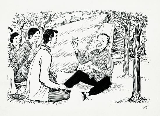 恽逸群同志曾多次在草寮的空地上给大家讲“蒋家王朝”的丑闻,内容生动而且形象,似乎他讲的每桩事情,都是他亲眼目睹的。(丁聪《东江百日杂忆》,组画)