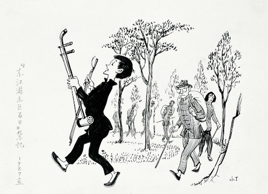 “画自己”也可以作为自己和社会的历史回顾。1987年,丁聪画了《东江百日杂忆》漫画组画(深圳美术馆藏),回顾了“我们一批在香港的进步文化人在共产党组织的安排下,经过‘东江纵队’(即今深圳宝安地区)向桂林转移。因战争原因道路不好走,在‘东江纵队’整整待了100天,白天休息,晚上赶路,这就是我后来画的‘东江纵队100 天’组画中的情况。”由此,“画自己”也就成了重大历史事件的形象记录,弥补了缺少影像资料的遗憾。
