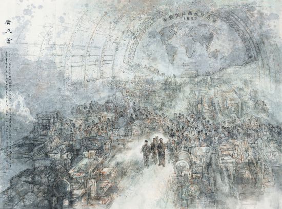 我后来在创作报告中记录下贯穿始终的几条思路:第一,以1957年第一届广交会会场为背景,描绘周总理前来视察的情形。相对客观地还原当时的会址——中苏友好大厦的机械厅。在大环境描绘基本不变的情况下,有意识地局部调整展品规模和人员密度,符合艺术表现的需要;第二,经过反复考证,确定了陪同周总理的叶季壮(商务部部长)、陶铸(省长)、严亦峻(特派员)、雷任民(商务部副部长)、曾生(市长),作为当时主要领导和广交会的贡献者们,集中分列左右;第三,加强线构成和透视感,这样绘画性更强,也符合历史大场景的经验。加强亚非拉及港澳客商的典型形象、人物群像,使用大场景,以大俯视的角度,使之更加经典并具有历史感。草图后来更改了4稿,又通过美术类专家多次评审,并解决了党史专家提出的几处问题,构思才获得了初步通过。