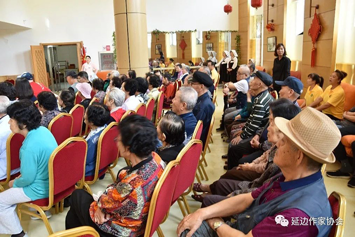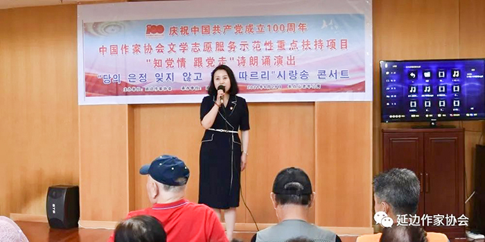 近日,由延边作家协会主办、诗朗诵协会承办的“知党情•跟党走”诗歌朗诵演出在长白山敬老院开展。活动开始后,延边作协党组书记、主席郑风淑和党组成员、副主席李惠淑亲切慰问金哲等离退休老同志、老作家、向他们致以问候和祝福并为他们送上鲜花,对他们为朝鲜族和延边文学做出的贡献表示感谢。在诗朗诵《太阳城》中,演出正式拉开序幕。随后,诗剧《革命者的妻子》《祖国,我永恒的保姆》、诗朗诵《祖国啊,我亲爱的祖国》、舞蹈《金达莱》等节目将演出推向高潮,赢得了老人们的阵阵掌声。