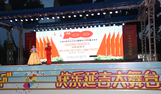 为庆祝中国共产党成立100周年,学习贯彻习近平总书记“七一”重要讲话精神,激发奋进力量,7月7日晚,中国作家协会2021年文学志愿服务示范性重点扶持项目——“知党情 跟党走”诗歌朗诵演出在延吉青年广场“延吉快乐大舞台”举行。延边诗朗诵协会诗歌朗诵艺术家及诗朗诵爱好者、延边大学学生等70多人参加诗歌朗诵演出,为广大市民献上一场文学盛宴。
