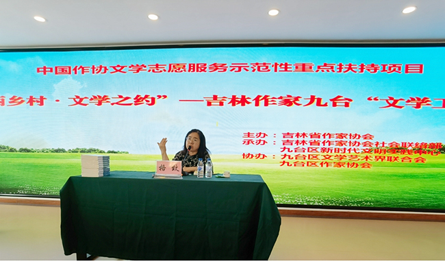 吉林省作协社联部主任李舟代表省作协向作家代表赠送书籍。九台区文联副主席、作协主席关开主持活动,九台区委宣传部常务副部长周皞出席,基层作家、农民作家和文学爱好者、文艺工作者50余人参加。