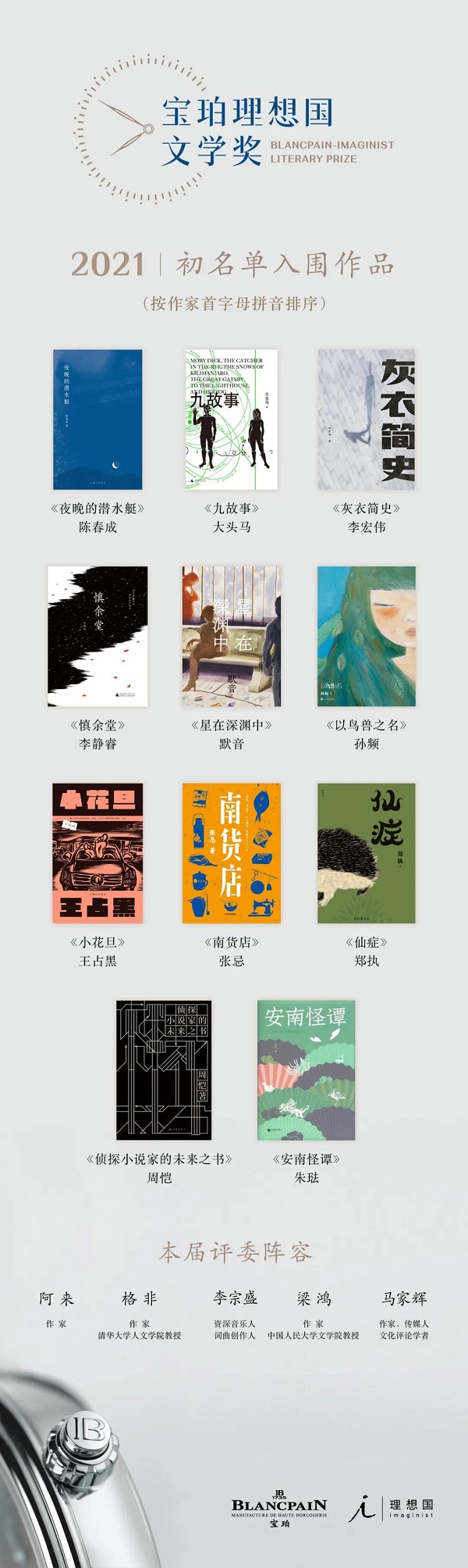 宝珀理想国文学奖由瑞士高级制表品牌BLANCPAIN宝珀与中国最具影响力的出版品牌理想国共同发起,是华语文学领域首个为发掘和鼓励45周岁以下的优秀青年作家,由商业品牌与出版社联合创立的奖项。宝珀理想国文学奖的设立,是为了让大众真正感受到“读书,让时间更有价值”。9月15日,文学奖评奖办公室将依据评委多数表决出的作品,公布最终入围决选名单的5部作品,敬请期待。