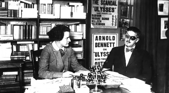 西尔维娅·比奇和詹姆斯·乔伊斯(当时眼疾日益严重) 在莎士比亚书店(1922年)