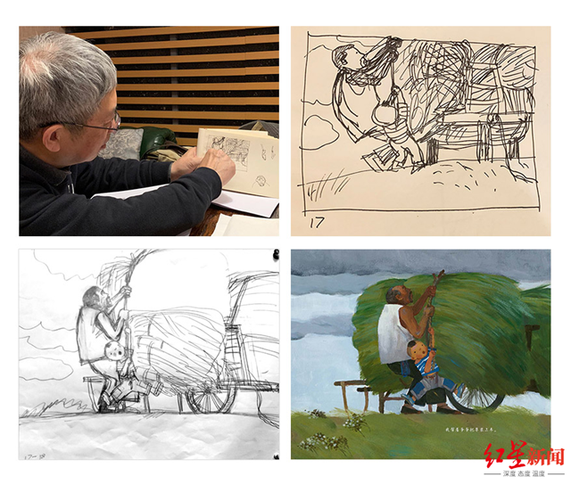 朱成梁提出了许多需要确认的问题:故事发生的时节?房子是什么样式?院子里都有什么?旁边有没有菜地或农田?里面都种了些什么?爷爷的手推车是什么样式?用什么样的绳子去捆草?草是什么样的?大河有多宽?河堤是什么样子的?